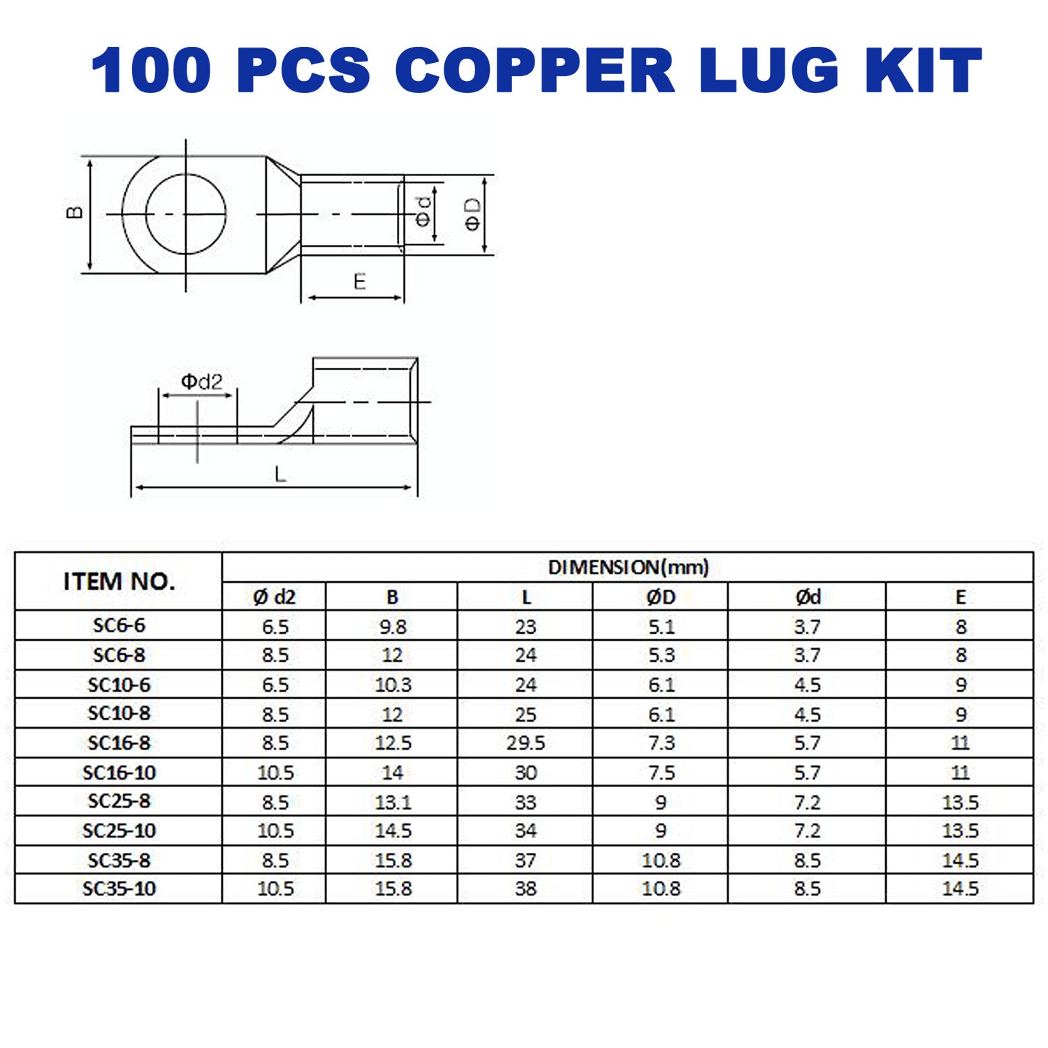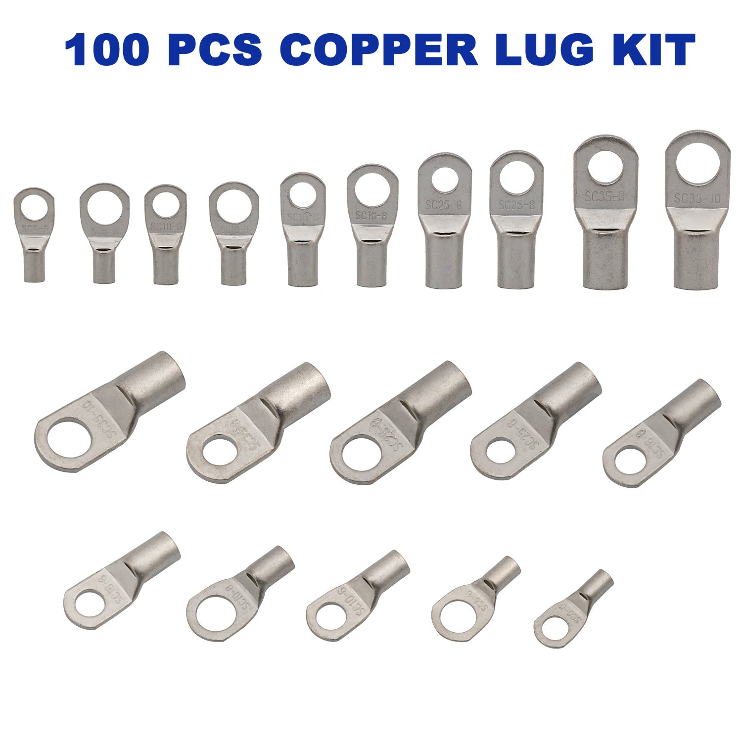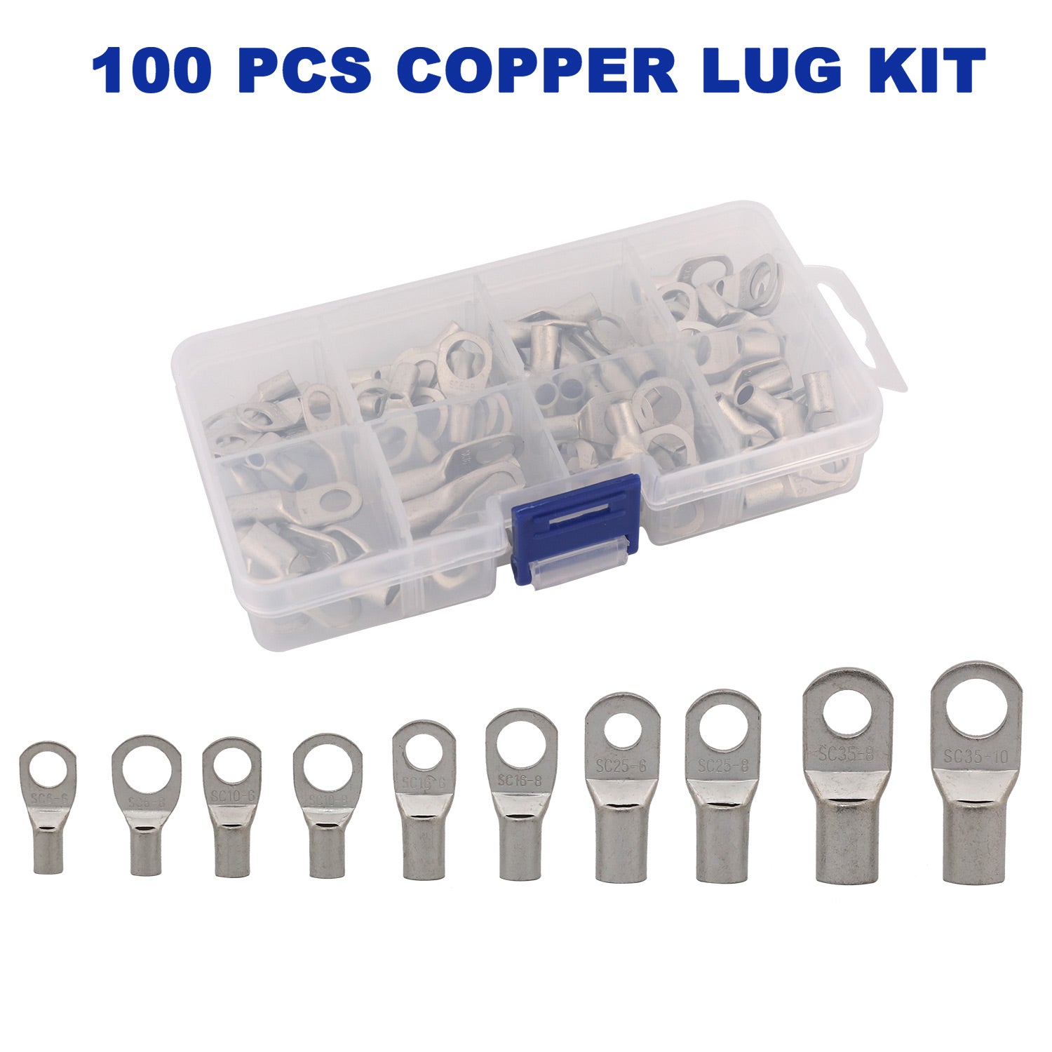 100 Pcs Copper Cable Lug Kit Battery terminal Lug Crimper SC6-6 ~SC35-10