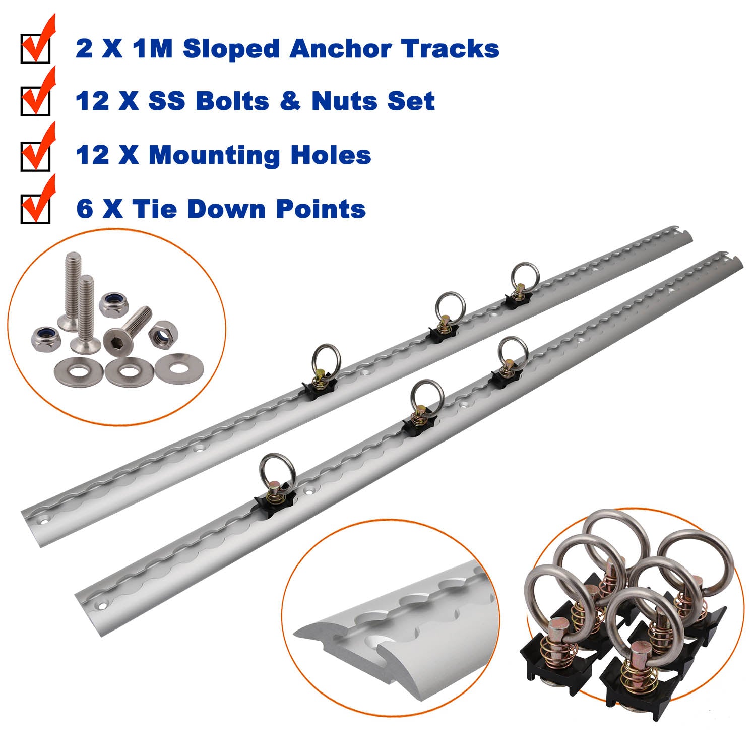 Unlike standard tracks, the sloped edge design allows for smooth rolling of wheeled objects, making loading and unloading more efficient. Each quick-release lashing point features anodized aluminum clips and stainless steel rings with a 900kg breaking strength (BS), ensuring strong and reliable hold for your cargo.