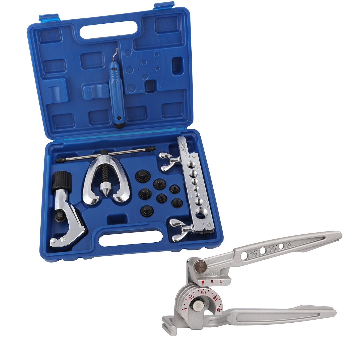 With a 45° eccentric flare tool and a comprehensive range of double flaring dies, this kit ensures accurate and secure connections in automotive, HVAC, and plumbing applications. The included tube bender and deburring tool provide added versatility, making this a must-have set for any workshop.