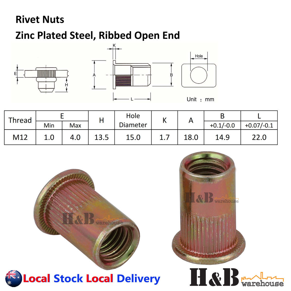 The M12 X 50 Pcs Nutserts Large Flange Ribbed Open End (T0348) are high-quality blind threaded inserts designed to meet worldwide industry standards. Made from durable zinc-plated steel, these nutserts provide a strong, reliable fastening solution across various applications, including automobile assembly, aviation, railway, furniture, and the electrical industry. Their ribbed body and large flange ensure enhanced grip and load distribution, making them ideal for secure and long-lasting connections.